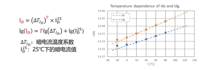 暗电流随温度的变化在对数坐标下是线性的。如下公式,因为暗电流随温度的变化是指数上升的,两边取对数可得,暗电流的对数与温度成正比,此外暗电流的温度系数的单位是 times/℃,而不是 A/℃。