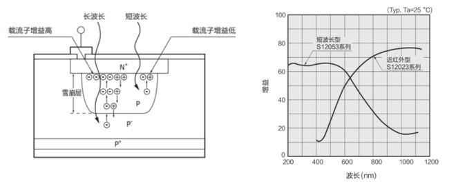 不同波长的光子入射深度不一样,波长更长的,入射深度更深。当载流子通过PN结附近的高电场时会发生雪崩倍增。对硅来说,硅的电子电离率高。