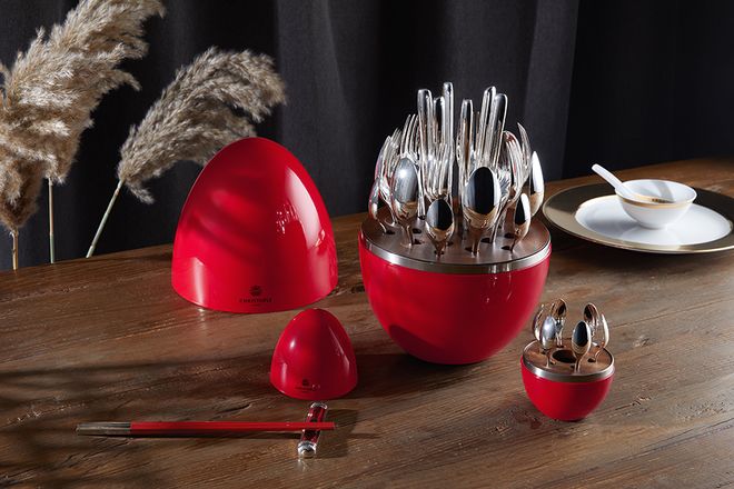 Christofle 以典雅庄重的中国红礼赞东方之美,这一色彩自古象征着喜悦、祥和与新生,为节庆赋予了浓烈的情感基调。光滑饱满的银质蛋形外壳,如同一个待启的节日惊喜,其内部暗藏的六件镀银餐具和24件套正餐套装,为“打开”这个动作赋予圆满与丰盈的寓意。当红韵映照银光,餐具便不再冰冷,它成为了情感本身,成为了家族共享的记忆联结。